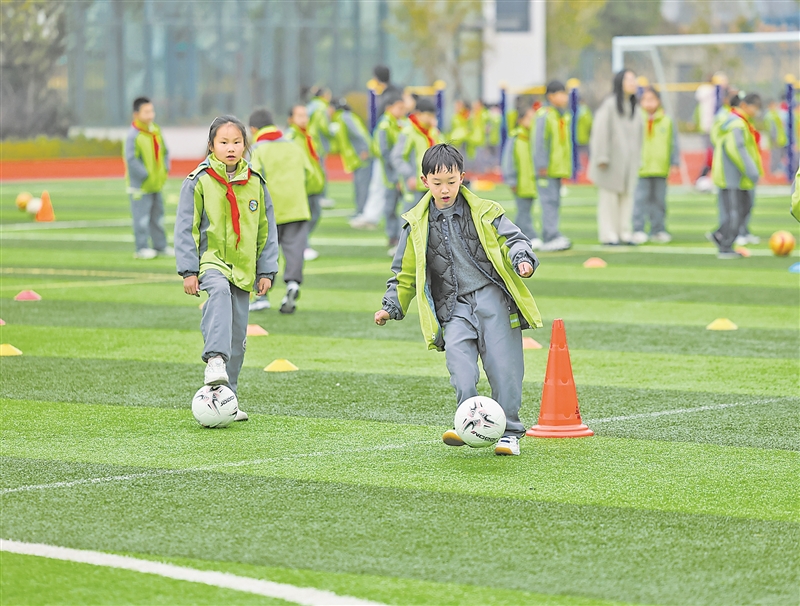 嘉兴市实验小学亚欧校区的学生们在参加开学第一课足球训练。新华社记者 徐昱 摄